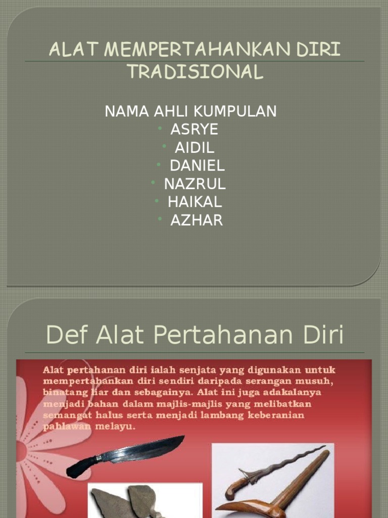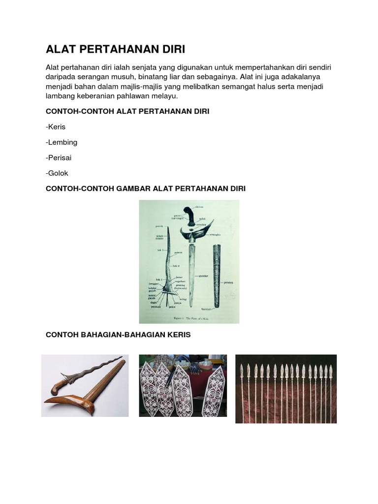 Alat pertahanan diri ialah senjata yang digunakan untuk mempertahankan diri sendiri. Keris ini boleh didapati di kawasan penduduk Melayu seperti Malaysia Singapura Thailand Indonesia Brunei atau Filipina Selatan. Di Jawa Barat Jabar atau Suku Sunda sendiri memiliki beberapa senjata tradisional yang unik serta.